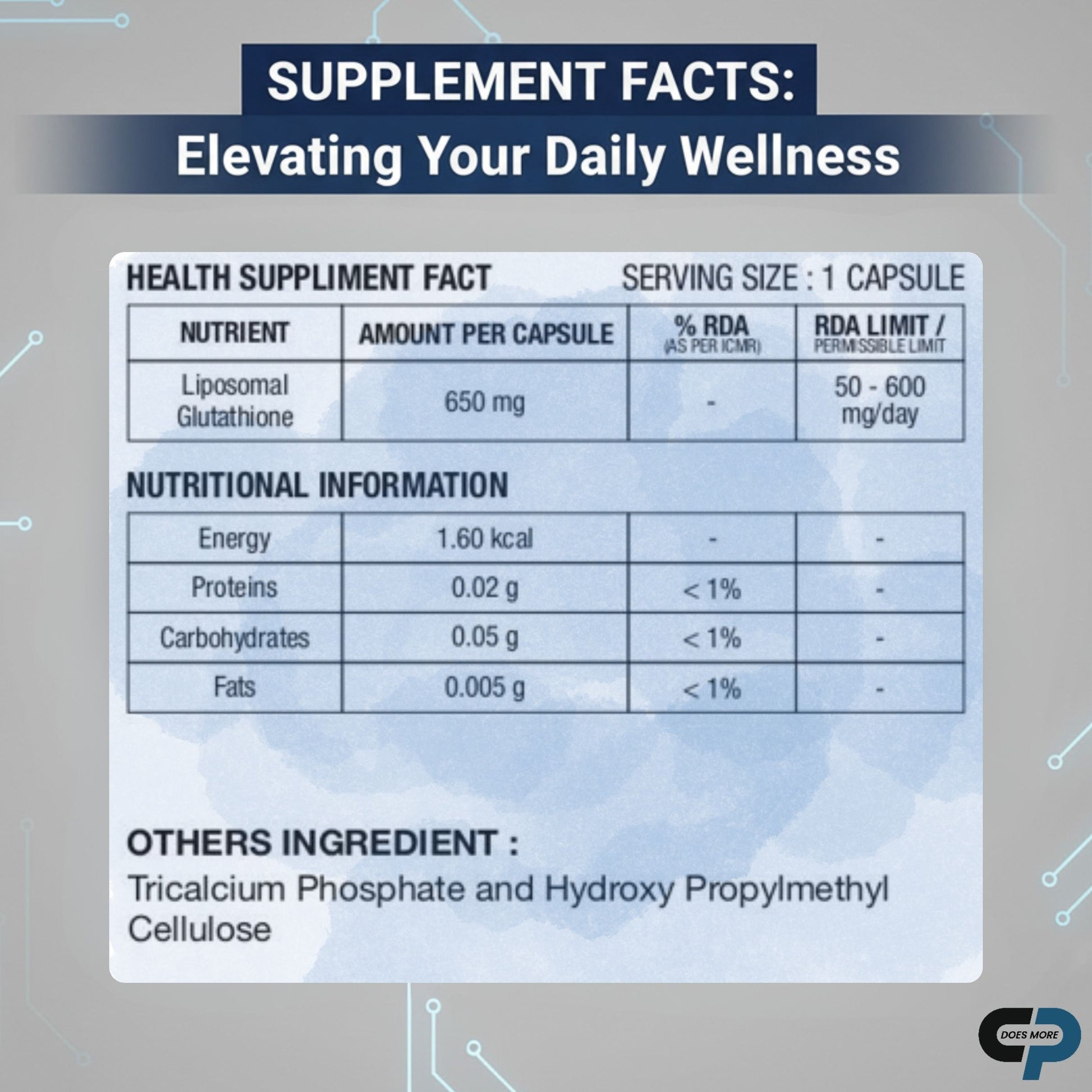 | Nutrient | Amount per capsule | % RDA (as per ICMR) | RDA Limit / Permissible |