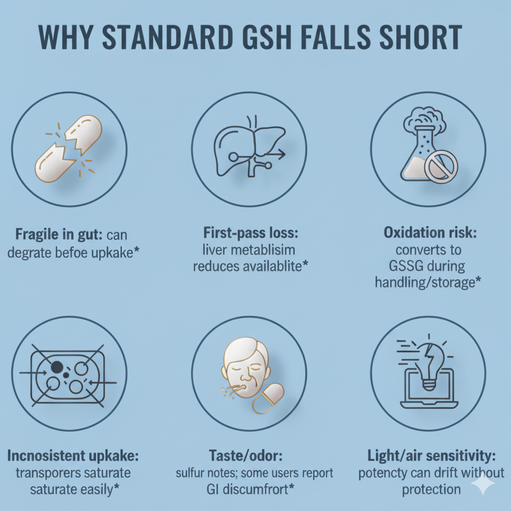Glutathione is encapsulated in phospholipid liposomes that help protect it in the GI tract and support efficient uptake.